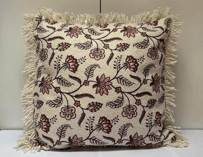 Bring an artistic and traditional touch to your living space with this floral embroidered cushion cover, designed to combine elegance with comfort. The intricately woven maroon floral patterns on a warm beige backdrop evoke a vintage charm, while the tassel fringe trim around the edges adds character and texture to any setting. Made with a durable cotton-polyester blend, the fabric offers a soft hand-feel and holds up beautifully to daily use. The cushion cover measures 45×45 cm (18×18 inches), making it a perfect fit for standard throw pillow inserts. Whether you’re styling your sofa, couch, bed, or reading nook, this cushion adds a cozy, curated look. The hidden zipper closure ensures a polished finish and makes it easy to remove and wash. Perfect for homes with a love for boho, traditional, or eclectic décor themes, this piece brings warmth and timeless style to any room. Note: Insert not included. Available as a single cushion cover or in a set of 2.